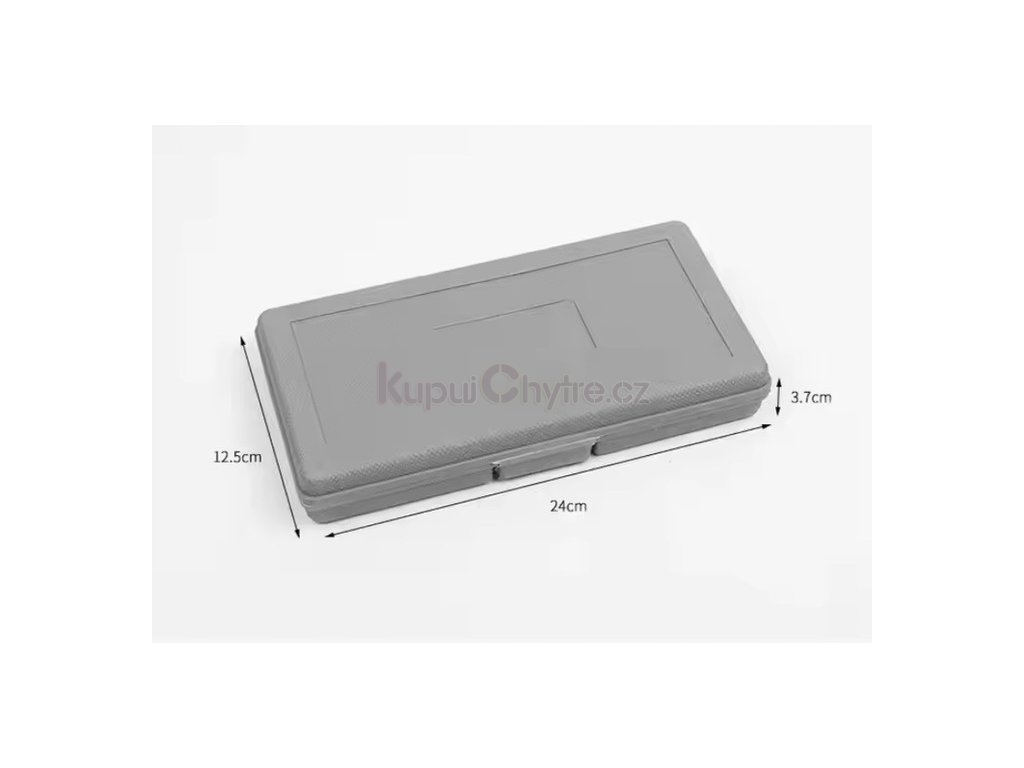 Celá sada je přehledně uspořádána v pevném plastovém pouzdře s přesně tvarovanými přihrádkami. Každý díl má své místo, což usnadňuje organizaci, přepravu i rychlé nalezení správného klíče. Box chrání nářadí před poškozením a zajišťuje, že se žádná součást neztratí.