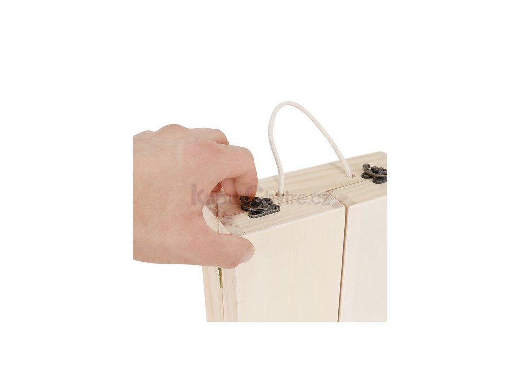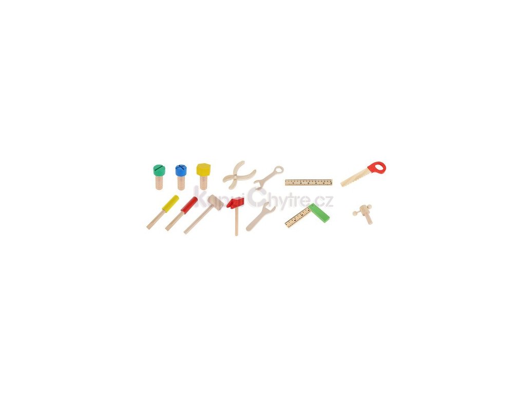 Box na nářadí je vyroben z kvalitního dřeva a doplněn pevnou bavlněnou šňůrou, která slouží jako pohodlné madlo pro snadné přenášení. Uvnitř se nachází přehledně členěné přihrádky, které pomáhají dětem udržovat pořádek v nářadí a učí je organizaci. Všechny části jsou natřeny zdravotně nezávadnými a certifikovanými barvami vhodnými pro děti.