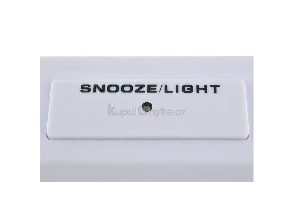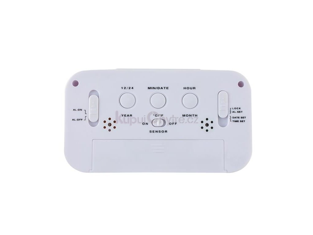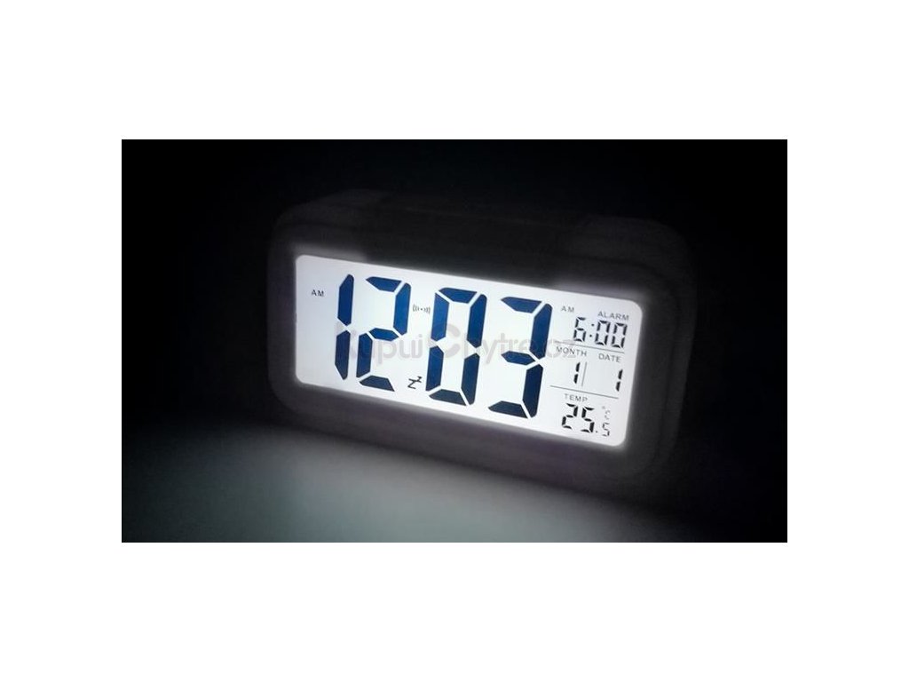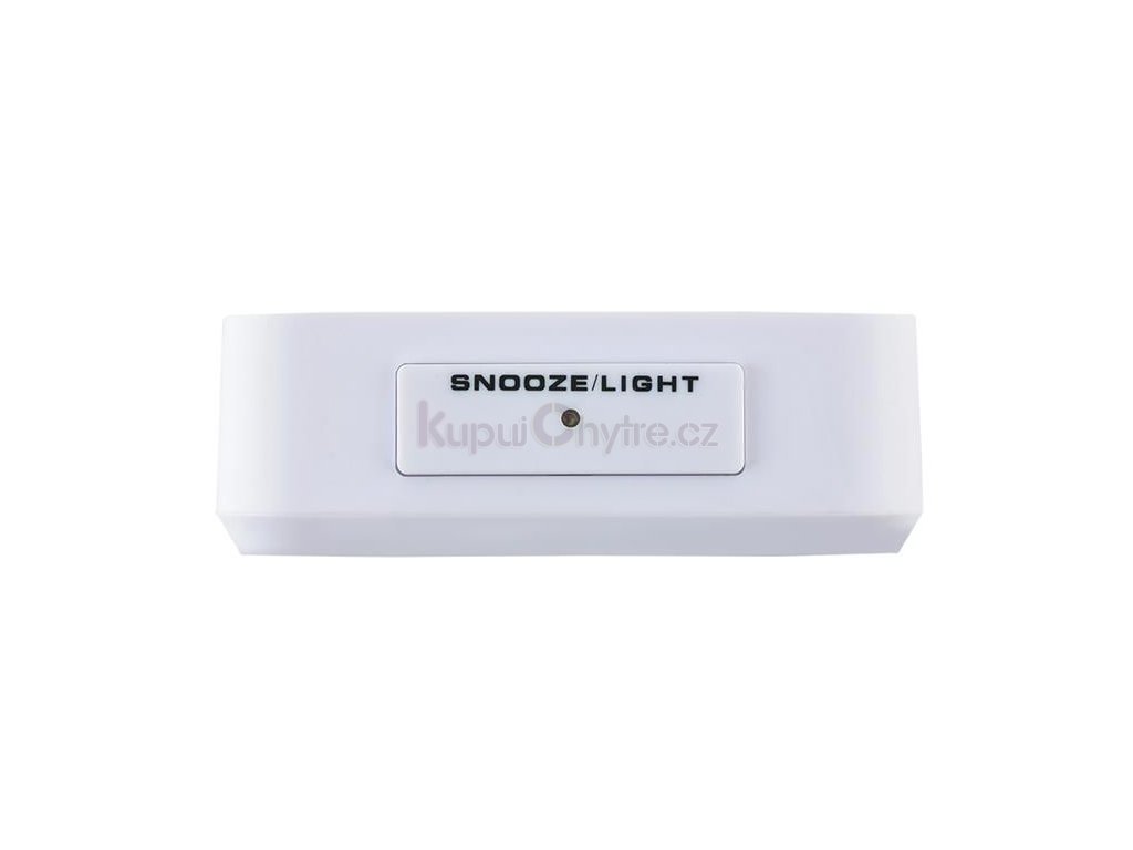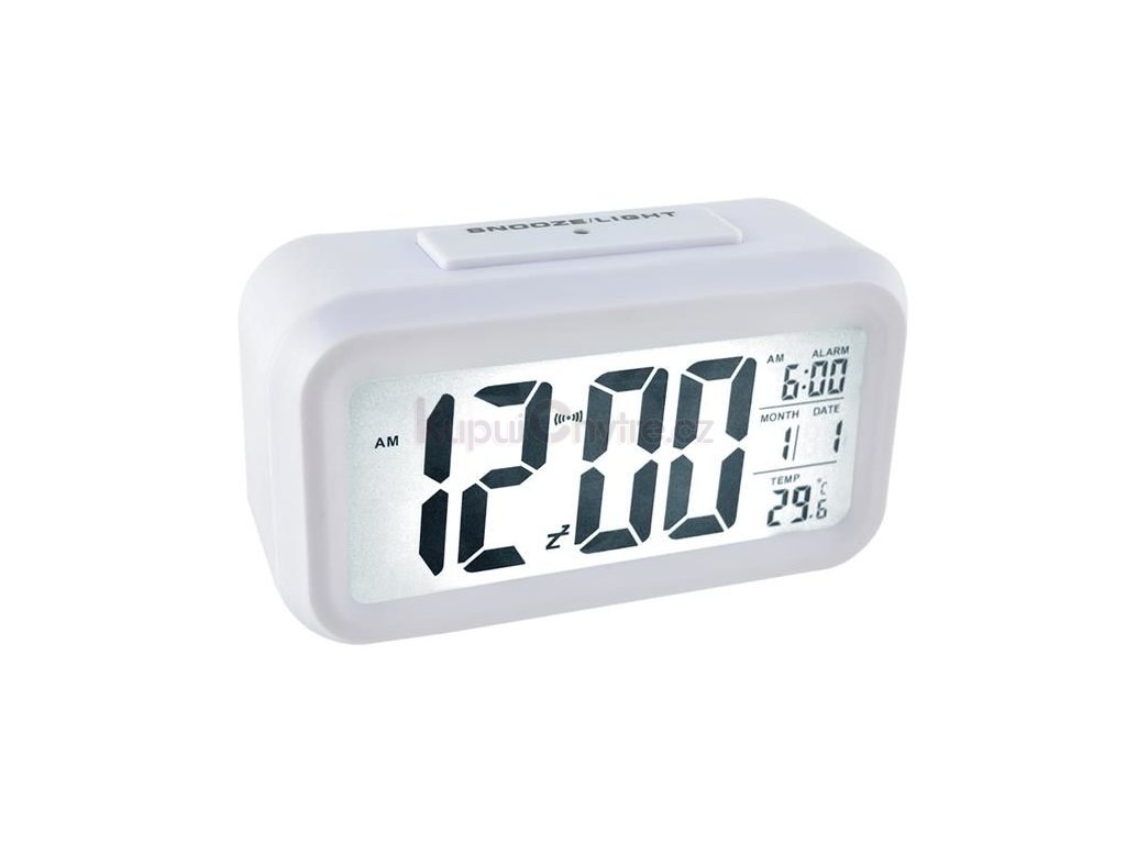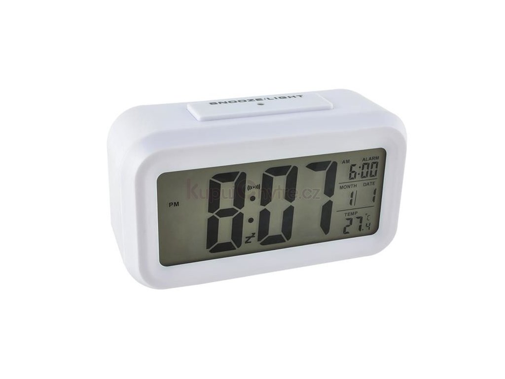 Elegantní digitální budík s velkou LCD obrazovkou a s funkcí zobrazení data a vnitřní teploty.