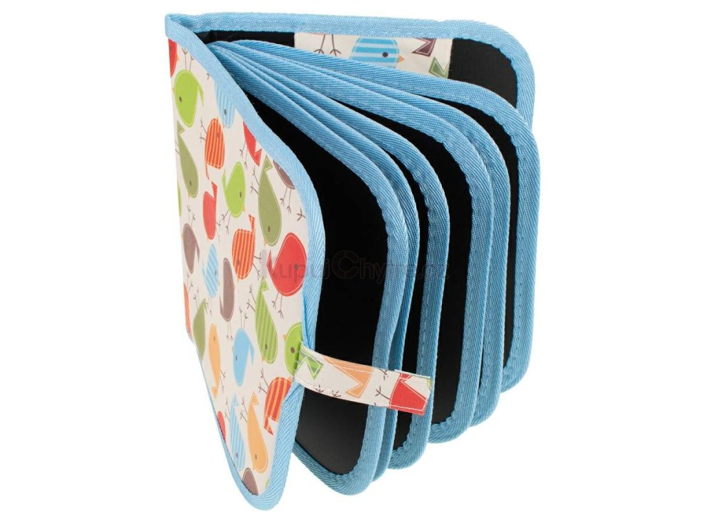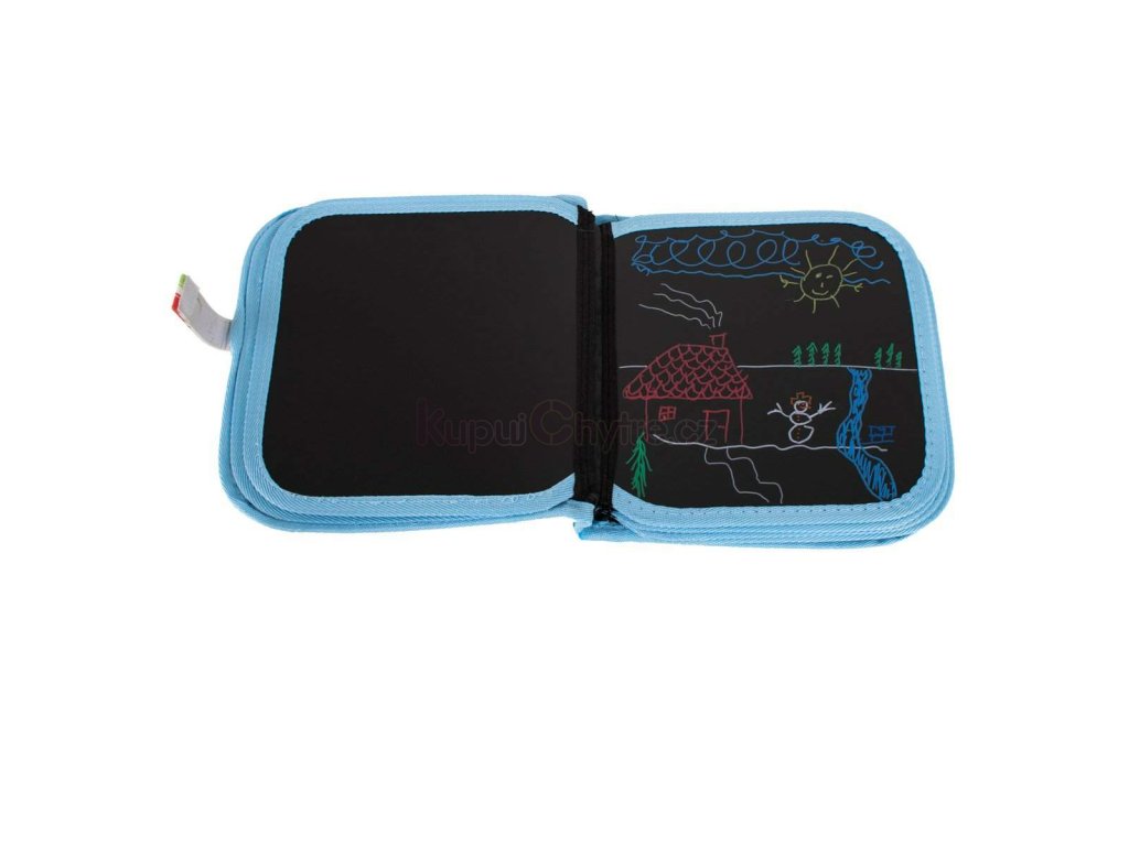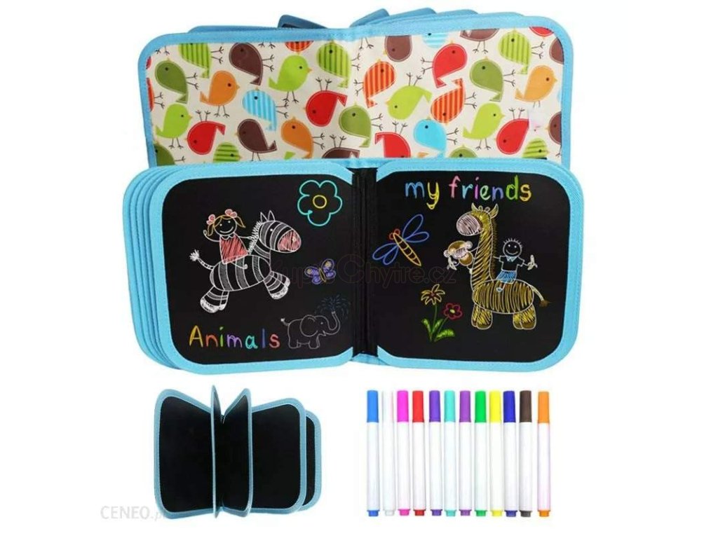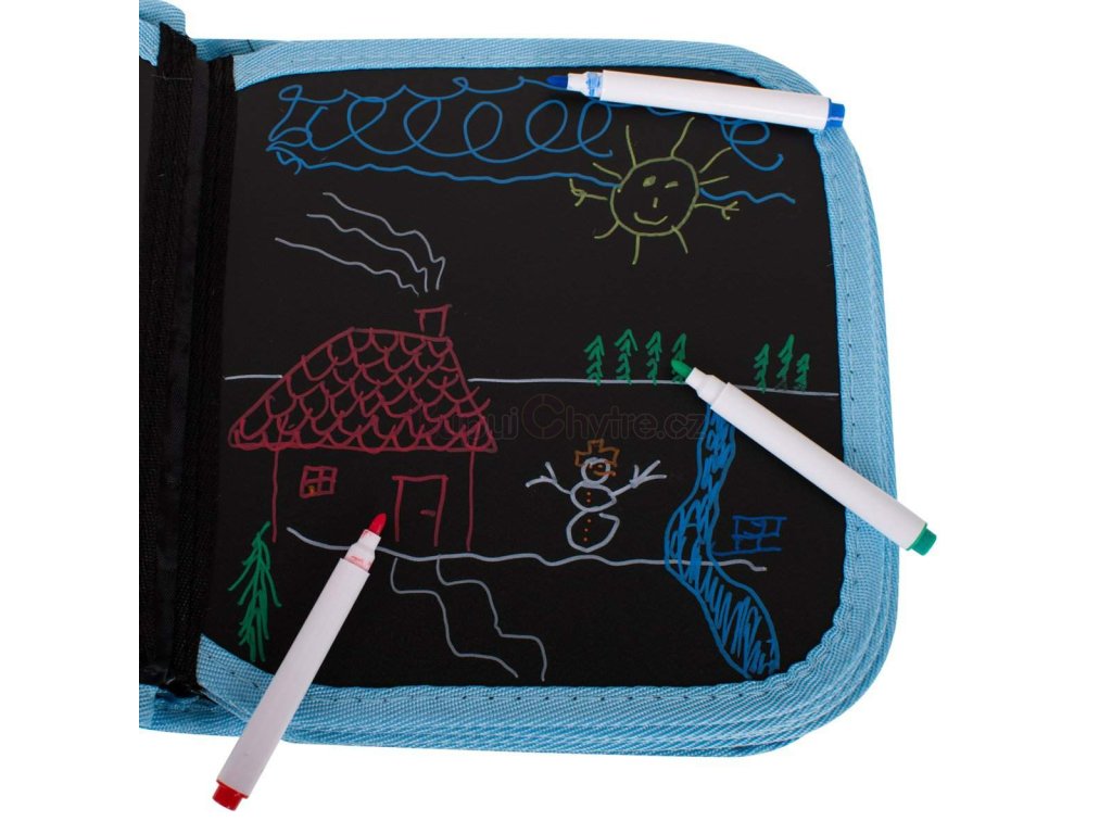 Přenosná kniha / notes se zapínáním na suchý zip s listy jako křídová tabule. Barevný obal povzbudí každé dítě ke hře a vybarvování. Vzhledem k tomu, že kniha není velká, může ji mít dítě stále u sebe. Sešit obsahuje 14 stran k malování, 12 křídových fixů, které lze smýt vlhkým hadříkem. Dítě si zdokonalí své manuální dovednosti a rozvíjí kreativitu.