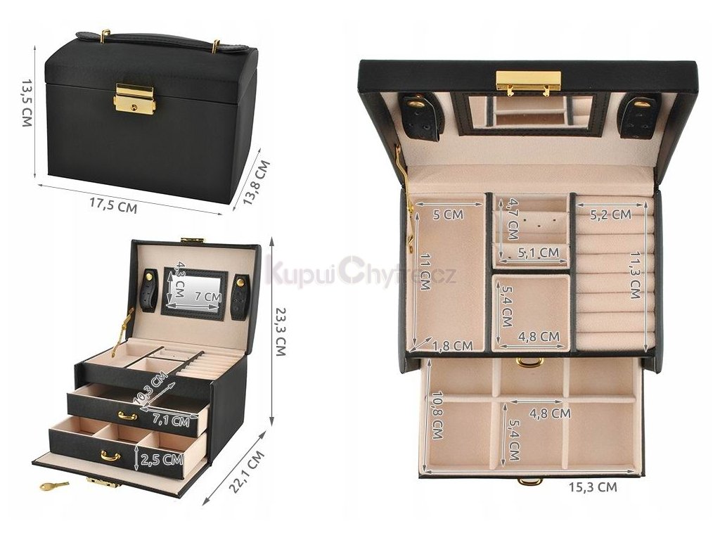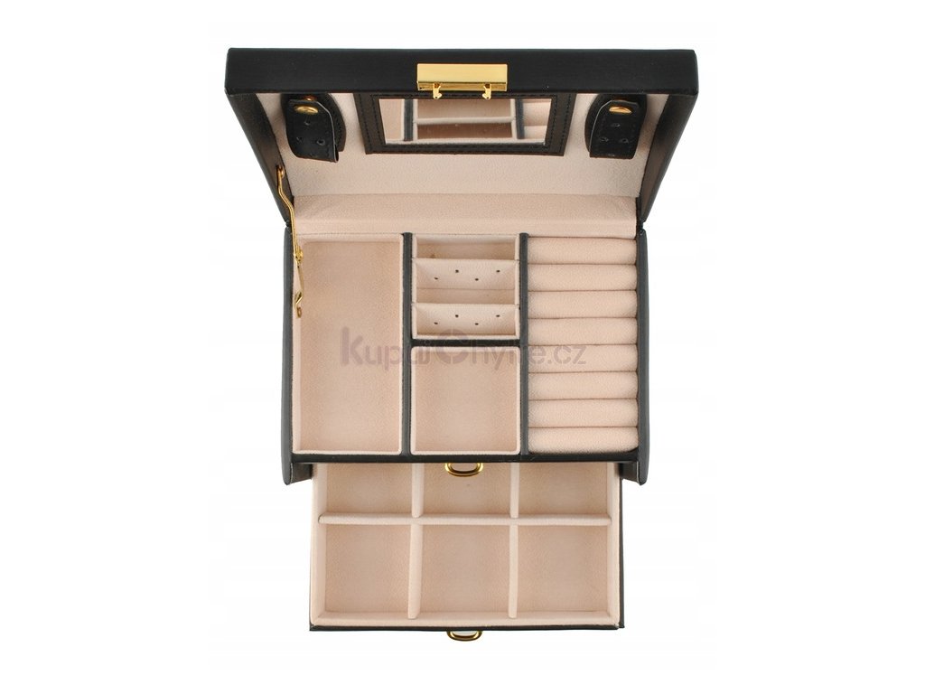 Luxusní a nadčasová šperkovnice nabízí celou řadu možností ukládání vašich cenností. Je ideální pro ukládání hodinek, náhrdelníků, náušnic, náramků, prstenů a dalších druhů šperků a bižuterie. Díky své praktičnosti a přehlednosti budete mít své doplňky vždy dokonale uložené a organizované a jejich čištění a přenášení bude maximálně pohodlné.