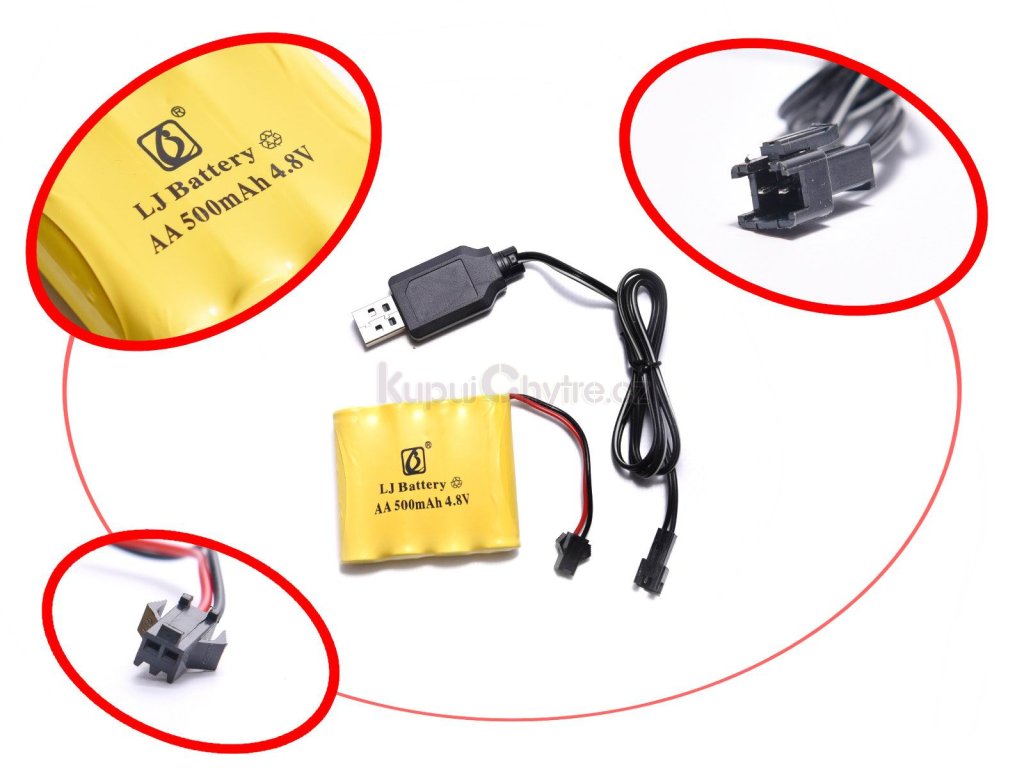 Vozidlo: lithium-iontová baterie, 500 mAh, 4,8 V (součást balení), dobíjecí USB (kabel součástí balení)